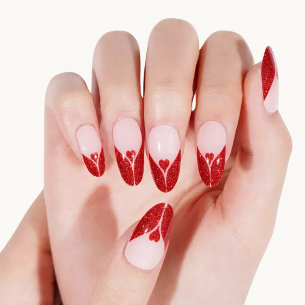 Monica ist ein auffälliger und glamouröser Gel-Nagelsticker mit einem leuchtend roten Herz in der Mitte eines funkelnden Designs, verziert mit rotem Glitzer auf transparentem Hintergrund. Dieses Modell bietet eine perfekte Kombination aus Raffinesse und Leidenschaft, ideal für besondere Anlässe wie den Valentinstag oder einen romantischen Abend. Mit seinem schimmernden Finish und dem langanhaltenden Halt verleiht Monica Ihrer Maniküre eine fesselnde und elegante Note und sorgt dafür, dass Ihre Nägel im Mittelpunkt stehen.