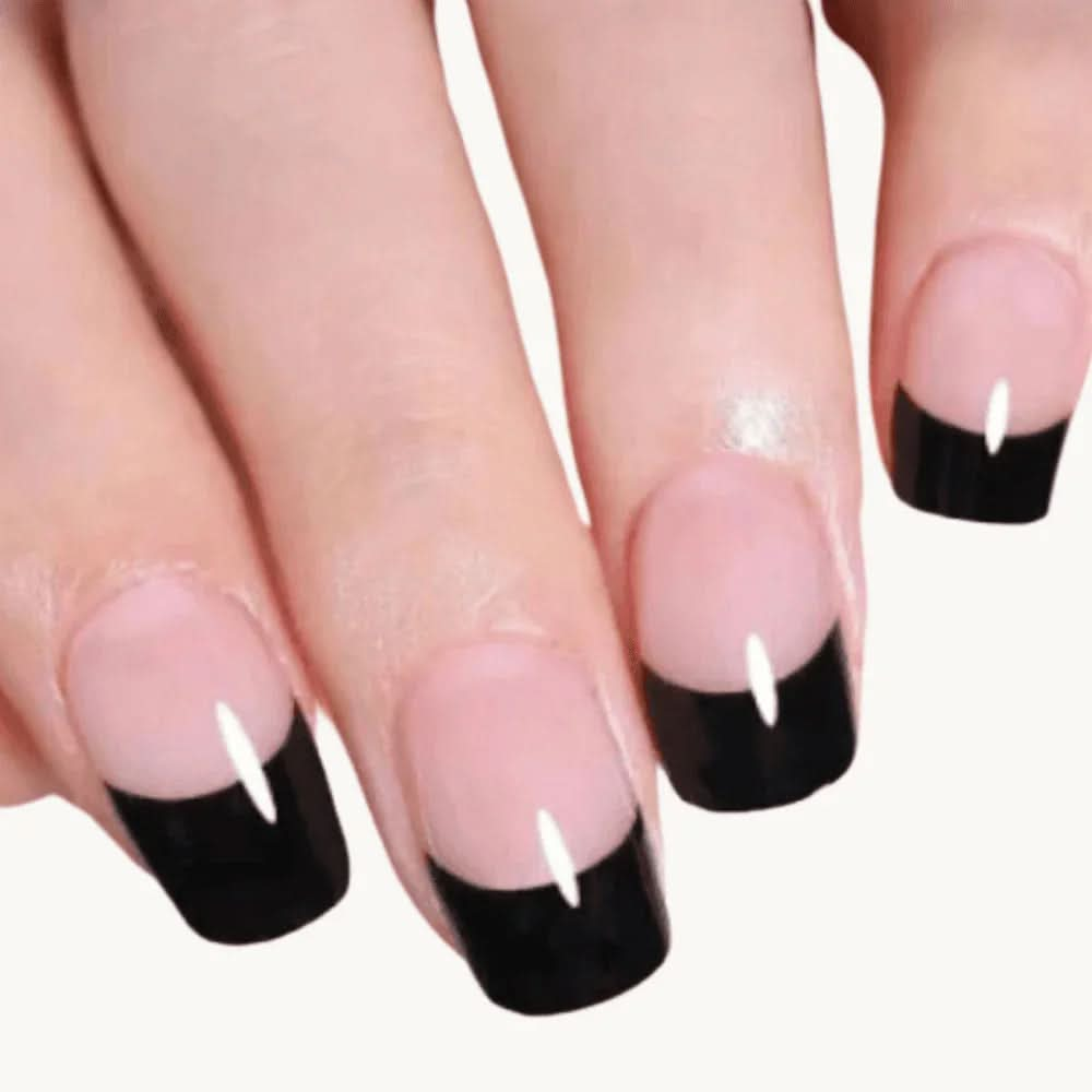 Susan es una manicura francesa negra que combina sencillez y audacia. Este diseño clásico renovado ofrece un contraste impactante, perfecto para un toque de sofisticación contemporánea. Para quienes buscan un estilo seguro sin ser recargado.