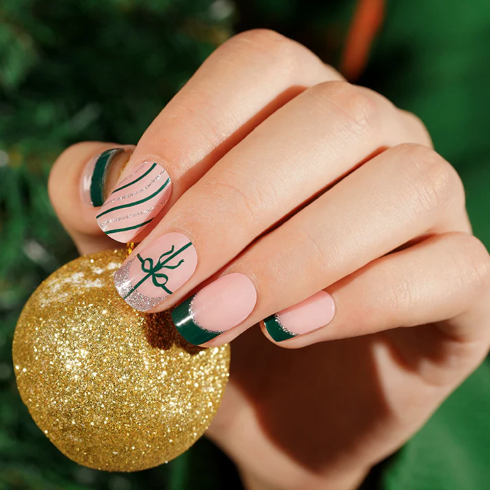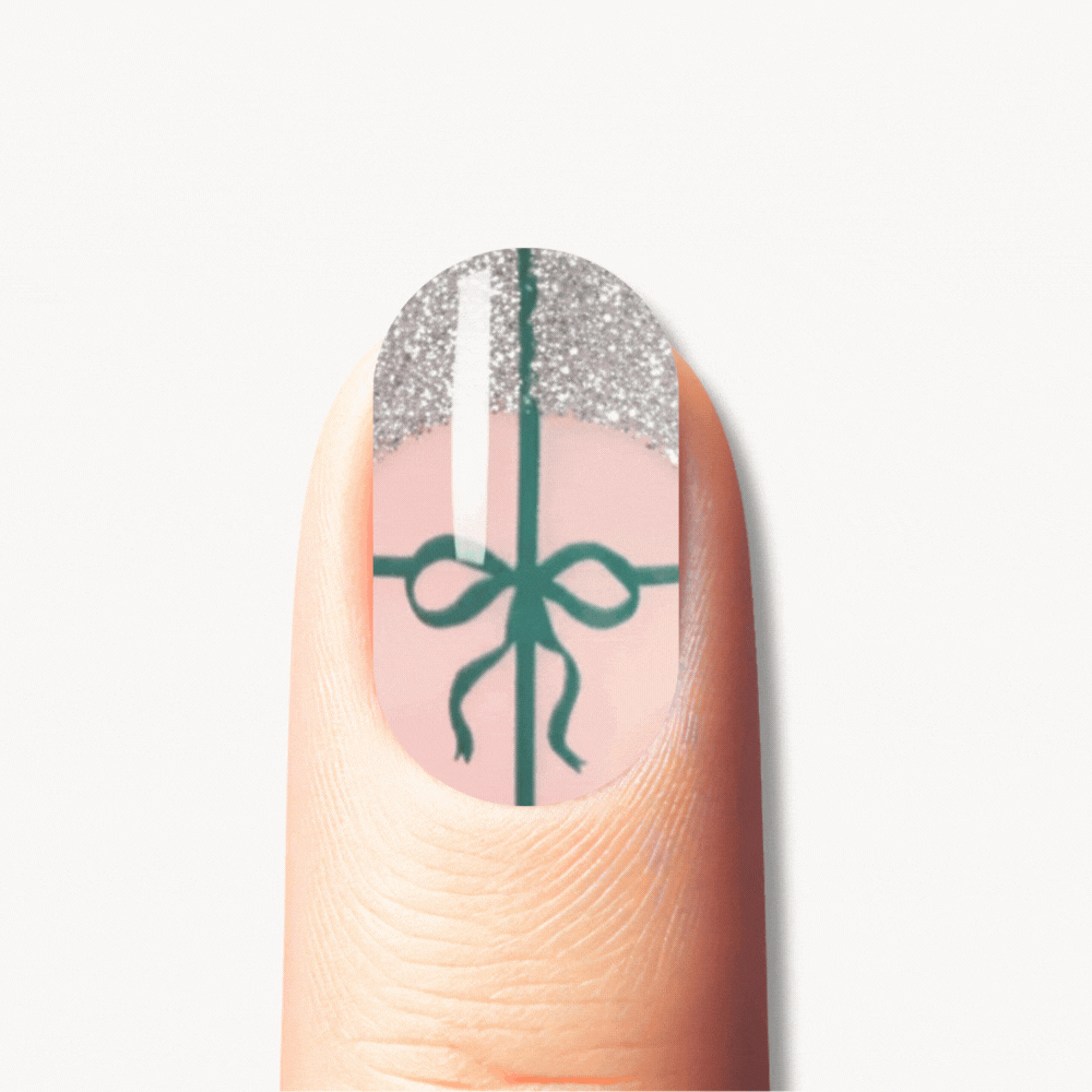 Forestine transforms the nude manicure into a truly festive and refined look. On a translucent pink base, the design features a stunning silver glittery free edge, reminiscent of a sparkling French manicure. In the center, a vertical and horizontal pine green ribbon forms a pretty, elegant, and graphic gift bow.
