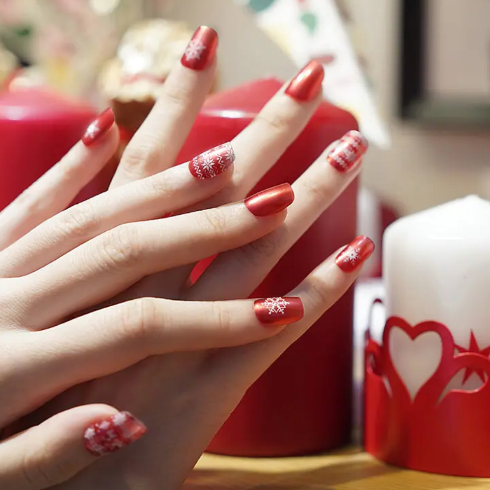 The Rudy color is a vibrant and festive red, adorned with Nordic motifs evoking the magic of year-end celebrations. This enchanting model transforms your nails into a true seasonal accessory, perfect for parading.