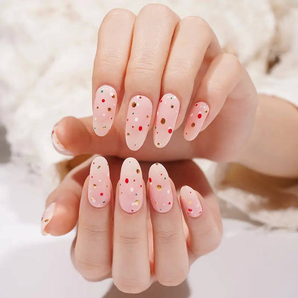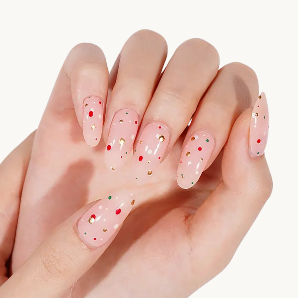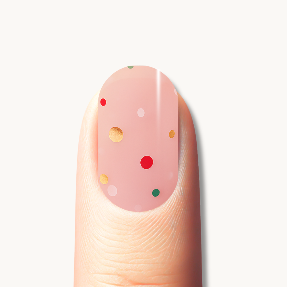 Belle is the joyful touch of elegance that was missing from your makeup. On a nude pink background, tiny red, gold, and green dots create the perfect balance between sophistication and festive spirit. Discreet yet glittering, a subtle accent.