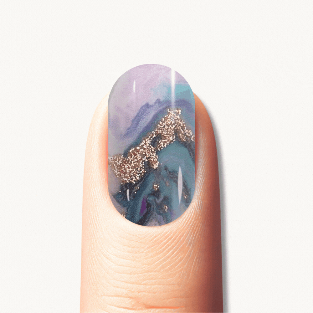 Lazura evokes the depths of the oceans and the raw beauty of minerals. Its marbled shades of blue, violet and gray are magnified by textured gold sparkles reminiscent of the veins of a precious stone. A sophisticated, bewitching manicure for those who like to combine mystery and elegance.